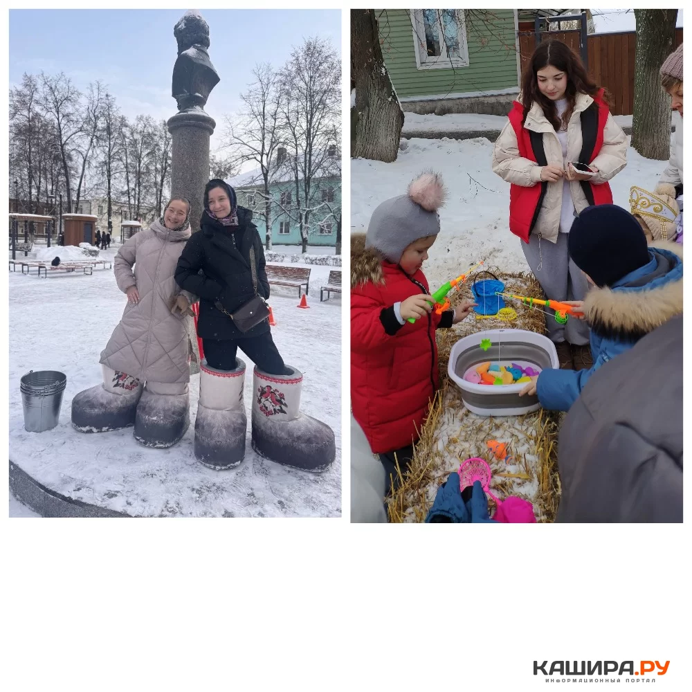 Поскольку второй день фестиваля объявлен Рыбным днём, то тематика развлечений была связана с рыбалкой. На зимней рыбалке холодно, поэтому без валенок не обойтись, да и вёдра необходимы. Бег в огромных валенках с вёдрами согрел участников. Для маленьких каширян в самый раз пригодилась игра «Рыбалка» с магнитными рыбками.