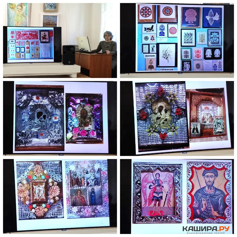 Светлана Леонидовна рассказала об иконах советского периода и напомнила, что иконы в 12 веке в Византии писались под оклад, неотъемлемую часть иконы. Яворская С.Л. занимается вырезанием из бумаги, написала книгу на эту тему «Искусство вырезания». Научный сотрудник исследует фольговые иконы в контексте искусства вырезания из бумаги, из кожи, из бересты и других материалов. Светлана Леонидовна представила презентацию с различными видами икон 12 стран мира музея Домодедово. Увлекательный рассказ о рукотворных иконах и производственного изготовления услышали гости музея.
