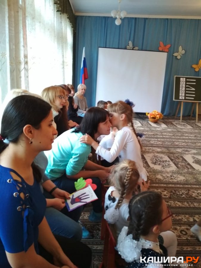 Дети дарили открытки с ладошкой и сердечком посередине родителям, обнимая, целуя их, произнося добрые слова.