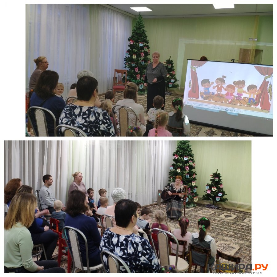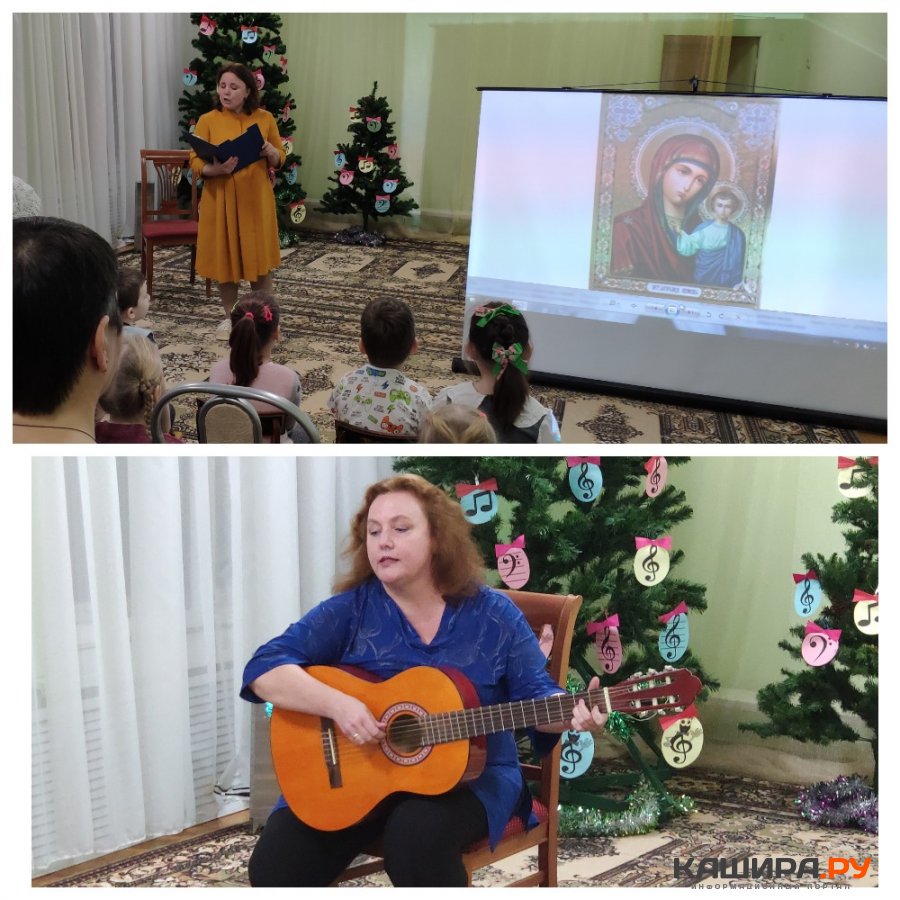 Кашира-православный город. Идет Рождественский пост. Уместно прозвучали тропарь Рождеству Христову, Ирмос Праздника Рождества Христова, песнь Богородице «Богородице Дево, радуйся» в исполнении воспитателя Царёвой Натальи Николаевны, которая служит в церкви Преображения Господня. Для детей такое пение необычное, они слушали, затаив дыхание.