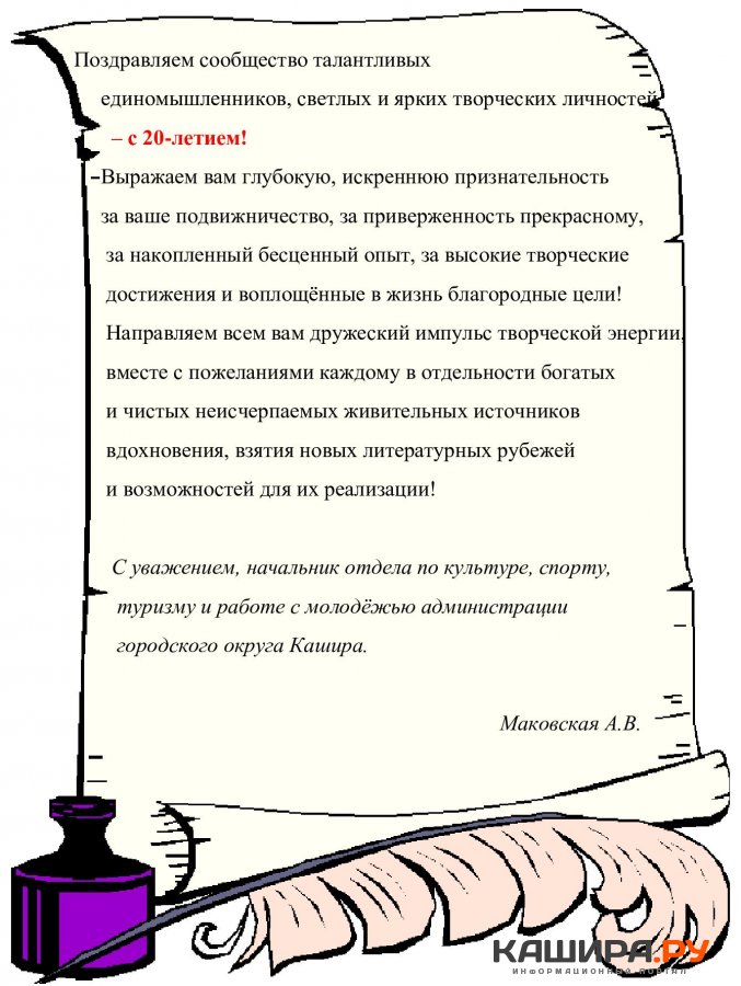 Поздравила с 20-летним юбилеем, рассказала о значении литературы в жизни людей. «Тем мы и отличаемся от зверей, что можем выразить своим мысли, чувства в поэзии»,- отметила Лилия Юрьевна.