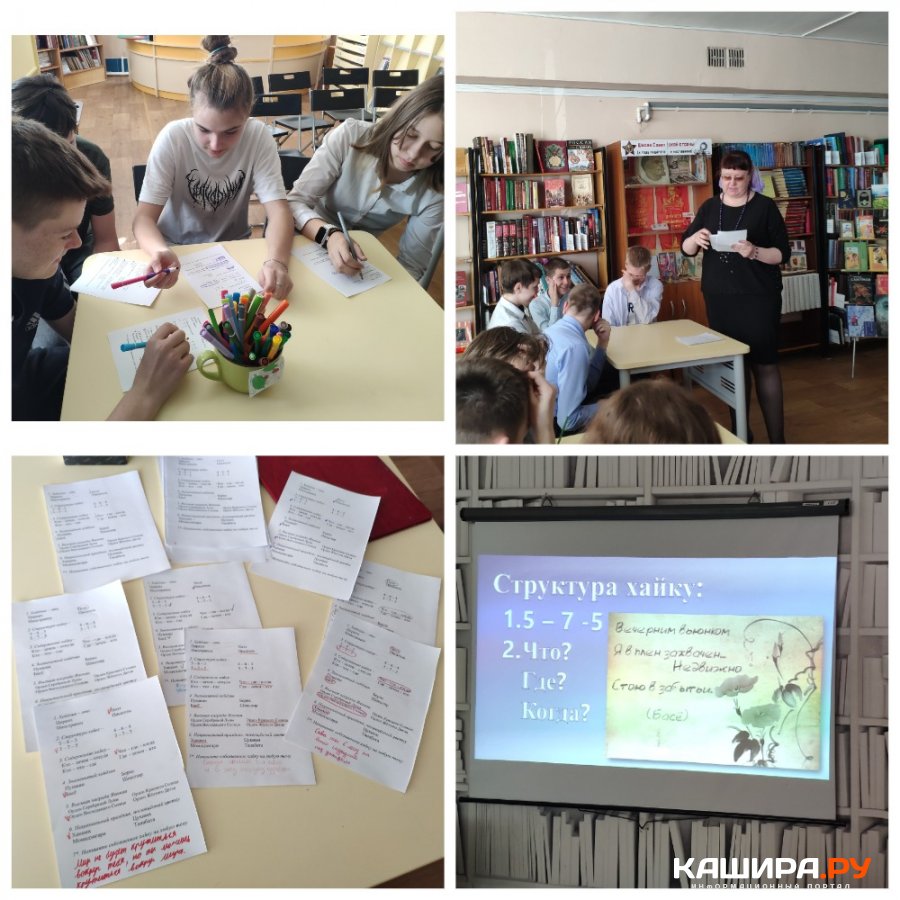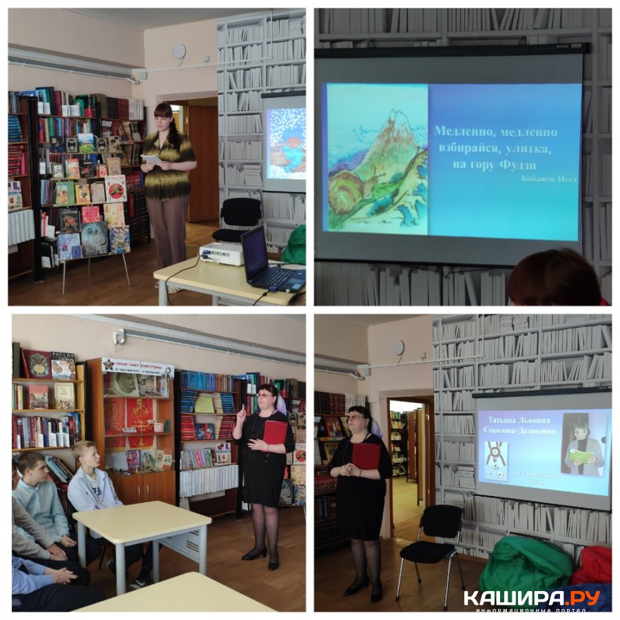 Обо всём этом школьники узнали 21 апреля 2023 года в читальном зале Центральной библиотеки Кашира2. Кочергина Галина Валерьевна, учитель по образованию с большой практической деятельностью, познакомила восьмиклассников (8А класс) СОШ №4 с японской поэзией. Школьники были внимательны и дисциплинированы. Думаю, их заинтересовала японская поэзия хайку, как и учителя русского языка и литературы СОШ № 4 Хегай Елену Сергеевну. Молодые люди были примером хорошей части современной молодёжи: увлечённые, уважительные, любознательные, культурные…