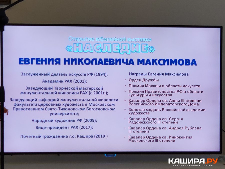 Владимир Анатольевич Марухин, начальник Управления образования г.о. Кашира, и Сергей Юрьевич Буров, председатель Совета депутатов, напомнили гостям, что мастер не в первый раз выставляет свои произведения в Каширском краеведческом музее, люди искусства дороги каширянам, картины воодушевляют, вдохновляют. Представители администрации так же напомнили, что Евгений Николаевич Максимов является Почётным гражданином Каширы.