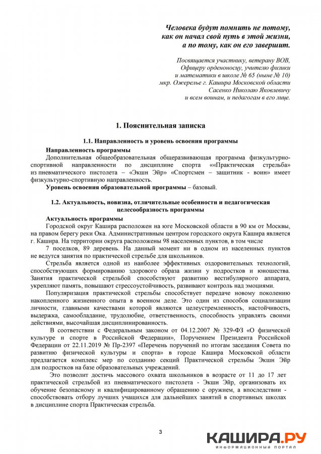 Свою Концепцию программы «Развитие вида спорта «практическая стрельба» и стрелковых дисциплин на основе создания спортивно-стрелкового комплекса в г.о. Кашира Московской области» автор разработал в соответствии с Указом Президента Российской Федерации от 21.07.2020 № 474 «О национальных целях развития Российской Федерации на период до 2030 года» одной из национальных целей является сохранение населения, здоровье и благополучие людей.