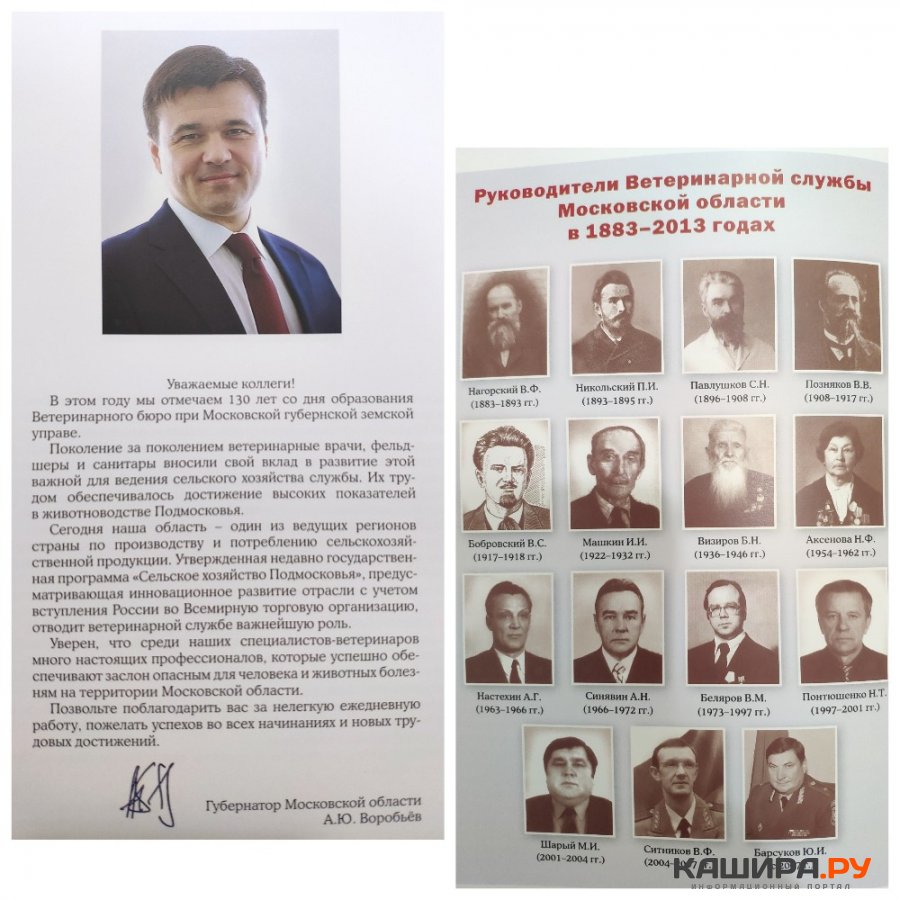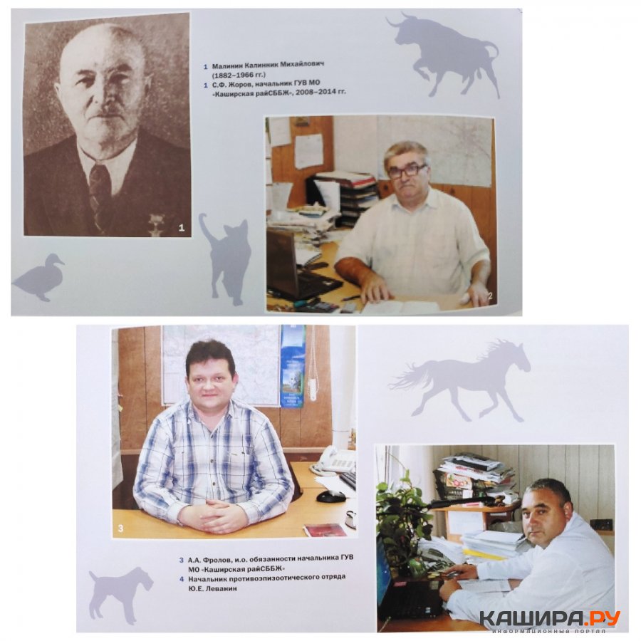 История государственной ветеринарной службы в Каширском районе Московской области ведёт своё начало с 1900 года. По сведениям Государственного архива Тульской области, в 1898 году в Каширском уезде вет.лечебниц, аптек, бактериологических кабинетов не было. В 1900 году станция Кашира включена в число станций погрузки и выгрузки рогатого скота. Назначение в Каширский уезд К.М. Малинина поменяло много. Организована работа по борьбе с болезнями животных, ликвидацией очагов опасных заболеваний. Руководители вет.службы менялись. В книге интересное повествование о людях, посвятивших жизнь ветеринарному делу, об их заслугах. Алексей Александрович умеет ценить и гордиться профессионалами.