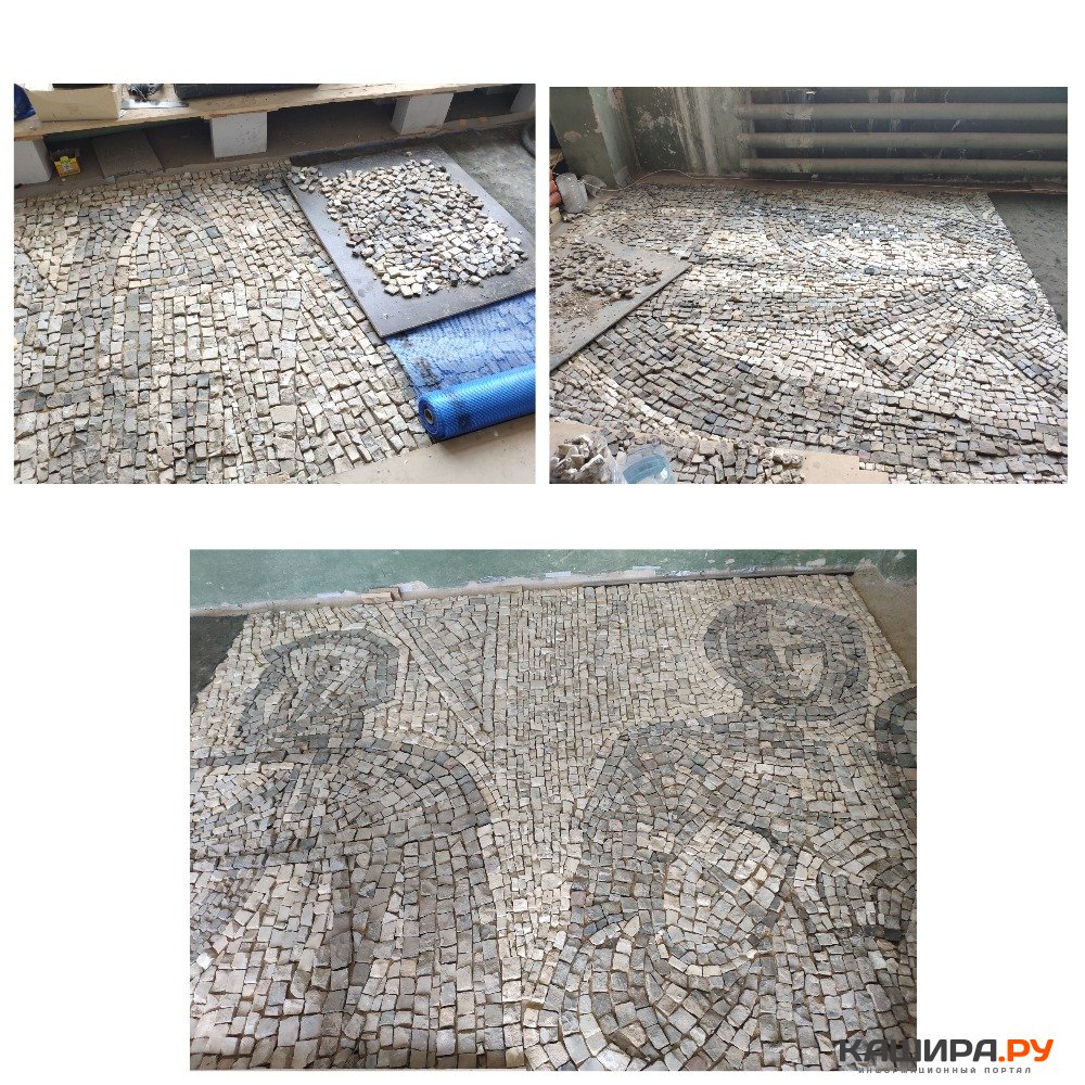 Вместе с помощниками Алексей отбивает составляющие рисунка – кусочки гранита, мрамора и смальты, после чего собирает заново, воссоздавая сегменты панно при помощи специальной технологии, укладывая на специальную основу – стеклотканевые сетки, что является надёжным материалом. Будет натягиваться три клеевых слоя. Затем всё получившееся разделят на части точно такого размера, как у старого панно, подготовив для монтажа. Конструкция будет намного легче.