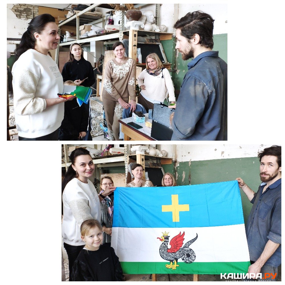 Члены муниципального отделения общества «Союз женщин России» г.о. Кашира поблагодарили Алексея Валерьевича Шмелёва за интересный рассказ и сохранение истории, памяти, поздравили мастера с наступающим праздником Днём защитника Отечества, вручив сладкий подарок и флаг Каширы для стимуляции выполнения работы в срок.