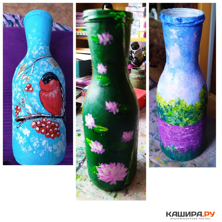 В этой же технике расписывались бутылки и превращались в вазы как для сухоцветов и искусственной зелени, так и для живых цветов.
