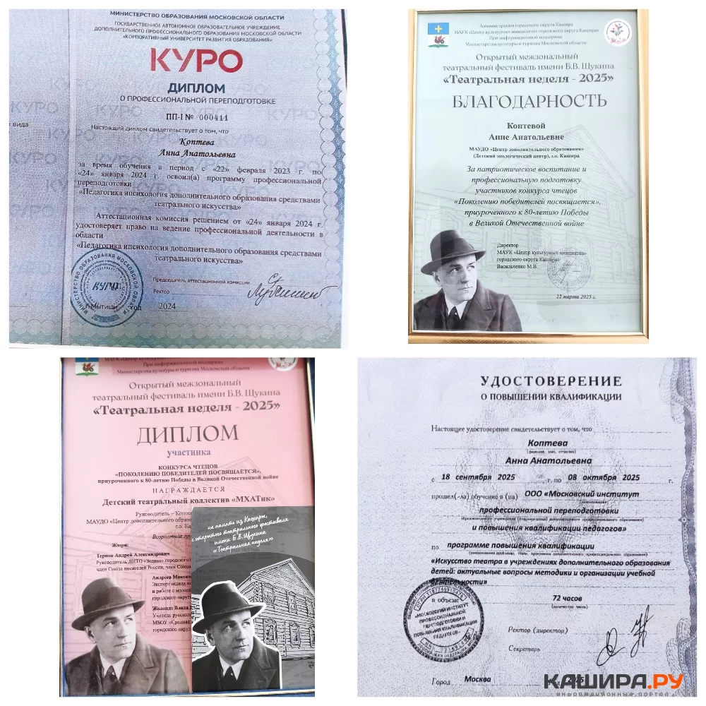 В 2024 году Анна Анатольевна Коптева прошла обучение по программе профессиональной переподготовки «Педагогика и психология дополнительного образования средствами театрального искусства».