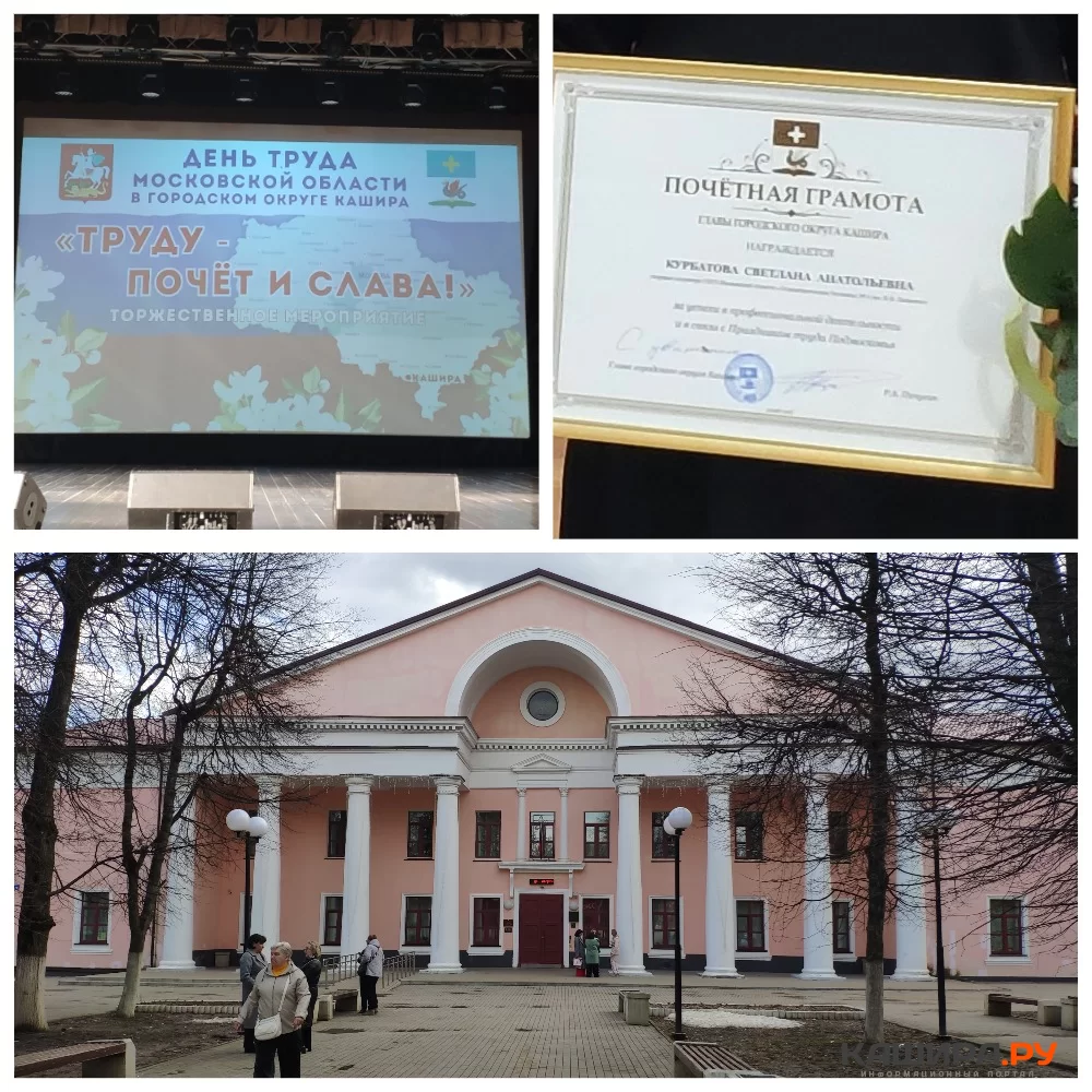 17 апреля на празднике «Труду – почёт и слава!» в ДК Ожерелье Курбатову Светлану Анатольевну наградил Почётной грамотой глава городского округа Кашира Роман Александрович Пичугин.